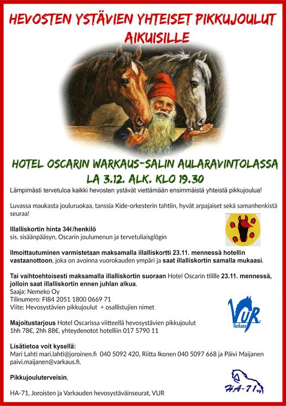 Majoitustarjous 1hh 78€, 2hh 88€ viitteellä "hevosystävien pikkujoulut" Hotel Oscar puh. 017 5790 11