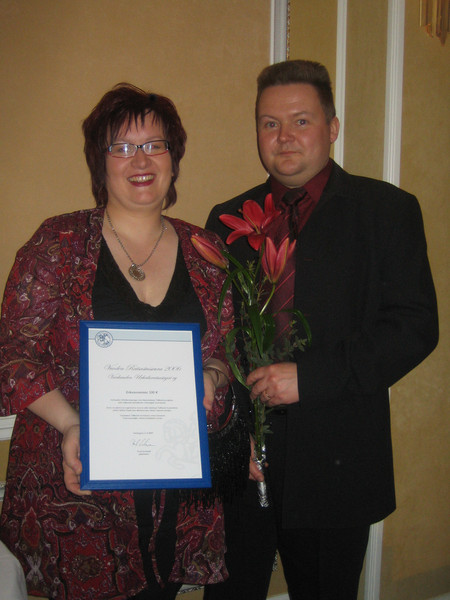Lauantaina 21.4. SRL:n juhlaillallisella jaettiin vuoden 2006 palkinnot. Varkauden Uhreiluratsastajat sai kunniamininnan ja 500 € palkinnon Vuoden Ratsastusseura-kilpailussa Tallityttö-projektista. Syksyllä 2006 aloitimme Tallityttö-projektin, jossa kokeneet junnut ovat auttamassa tallilla alkeiskurssilaisia. Heillä on päällään keltaiset huomioliivit, joissa lukee selässä tallityttö, jotta heidät erottaa porukasta. Näin alkeiskurssilaisten on helppo lähestyä heitä. Heiltä voi kysyä apua hevosenhoidossa ja he itsekin tarjoavat apuaan aktiivisesti mm. satuloinnissa, suitsinnassa ja muissa varusteiden laitossa. Tällä toiminnallaan he kartuttavat matkakassaansa tuntiratsastajien mestaruuksiin. Palkinnon vastaanottivat Minna ja Janne Heikkinen. Kuva: Taru Ijäs |