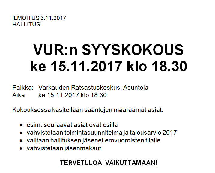 VUR Seuran Syyskokous ke 15.11.2017 klo 18:30 Varkauden Ratsastuskeskuksen asuntolassa