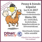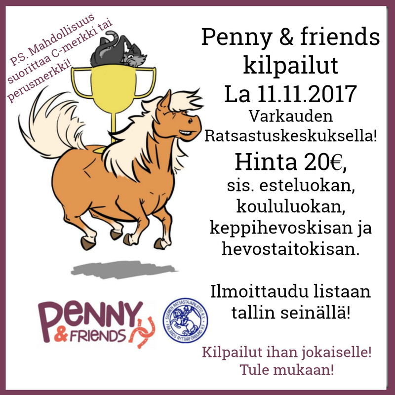 Ensi viikon lauantaina kisataan Penny&Friends kisapäivän merkeissä. Tervetuloa katsomaan mukavia lasten kilpailuja ja tutustumaan talliin sekä hevosiin, päivässä myös talutusratsastusta! Varkauden Ratsastuskeskuksella lauantaina 11.11. kello 10 alkaen. Liitteet