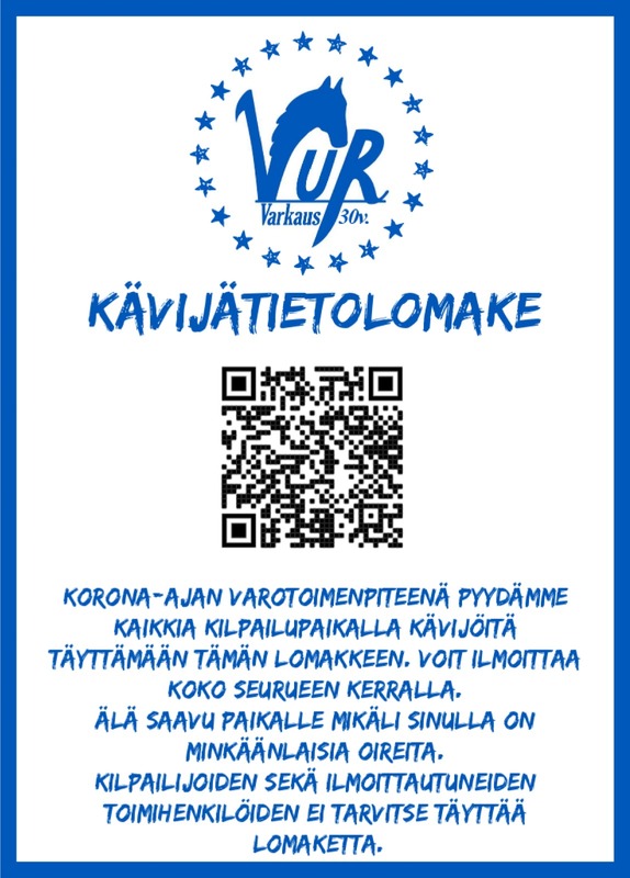 Korona-ajan varotoimenpiteenä pyydämme kaikkia kilpailupaikalla kävijöitä täyttämään tämän lomakkeen. Voit ilmoittaa koko seurueen kerralla. Älä saavu paikalle mikäli sinulla on minkäänlaisia oireita. Kilpailijoiden sekä ilmoittautuneiden toimihenkilöiden ei tarvitse täyttää lomaketta.