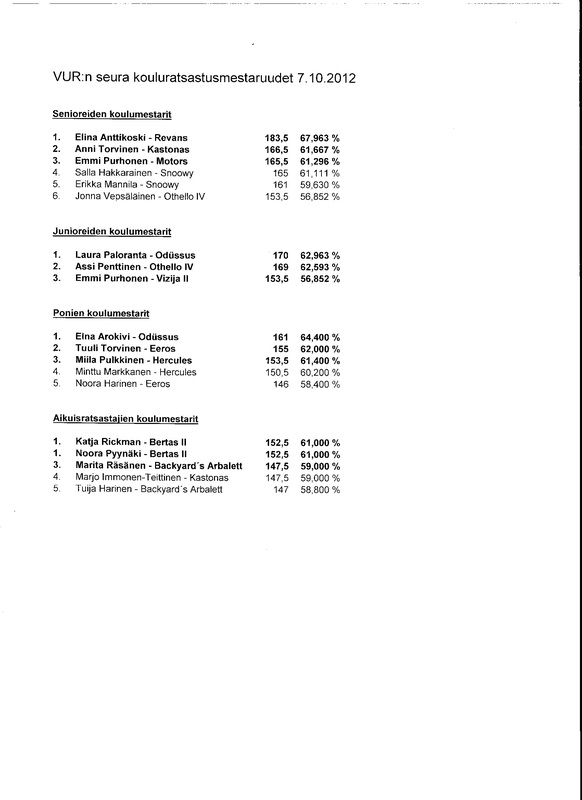 VUR:n kouluratsastuksen seuramestarit ovat senioreissa Elina Anttikoski-Revanss, junioreissa Laura Paloranta-Odüssus, poniratsukoissa Elna Arokivi - Odüssus ja aikuisratsastajissa Katja Rickman ja Noora Pyymäki ratsunaan Bertas II . Elina Anttikoski- Revanss ratsasti kahden luokan voittajaksi A-merkin kouluohjelmassa ja aikuisratsastusmerkin ohjelmassa. Luokan 3 voittoon ratsasti Miila Pulkkinen- Fanta. Liitteenä luokkatulokset ja mestaruustulokset. Galleriasta löytyy muutama kuva luokasta 1. Liitteet