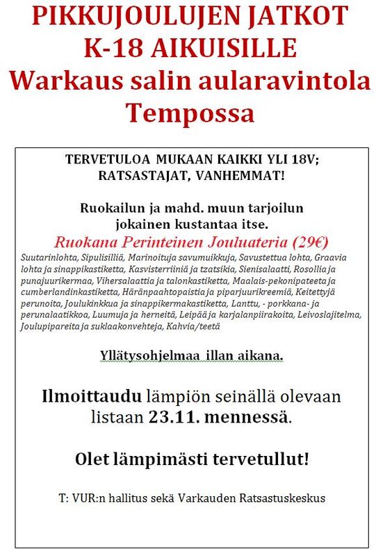 Aikuisten jatkot jatkavat iltaa Warkaus-Salin aularavintola Tempossa; Tervetuloa mukaan kaikki yli 18 vuotiaat ratsastajat ja vanhemmat! Ruokailun ja mahd. muun tarjoilunjokainen kustantaa itse.